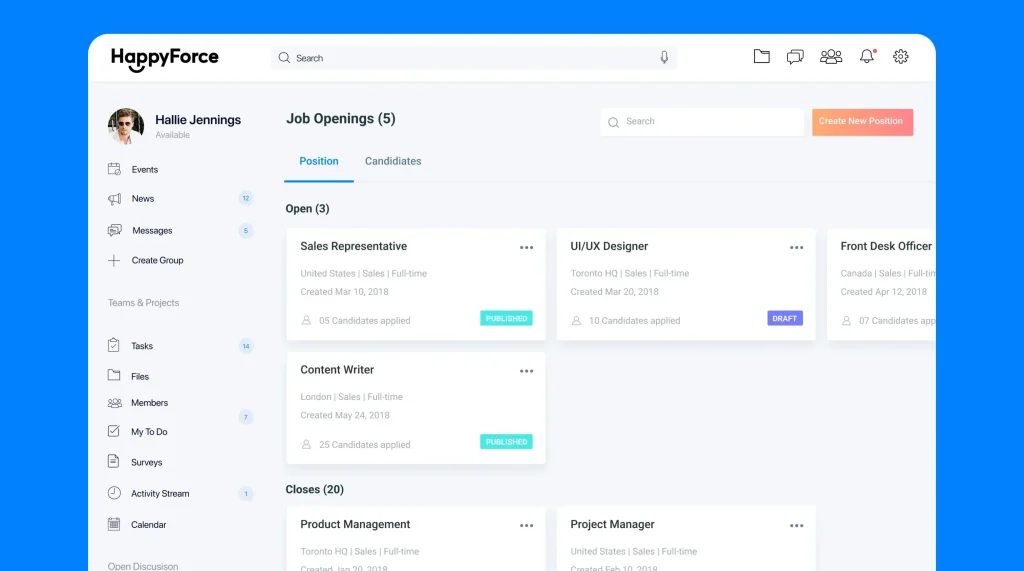 Destro HappyForce includes a job portal where you can enlist jobs, filter candidates, send invitations to potential candidates, screen in the finalized candidates, etc. Moreover, the portal lets you take suggestions from the people within the organization on whether the candidate should be hired or not.